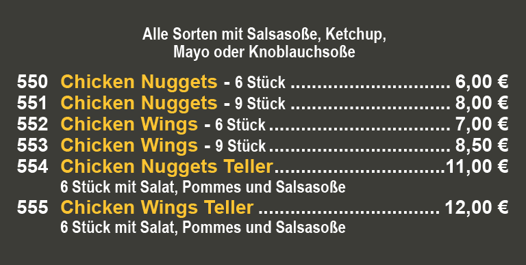 alle Sorten mit Salsasoße, Ketchup, Mayo oder Knoblauchsoße