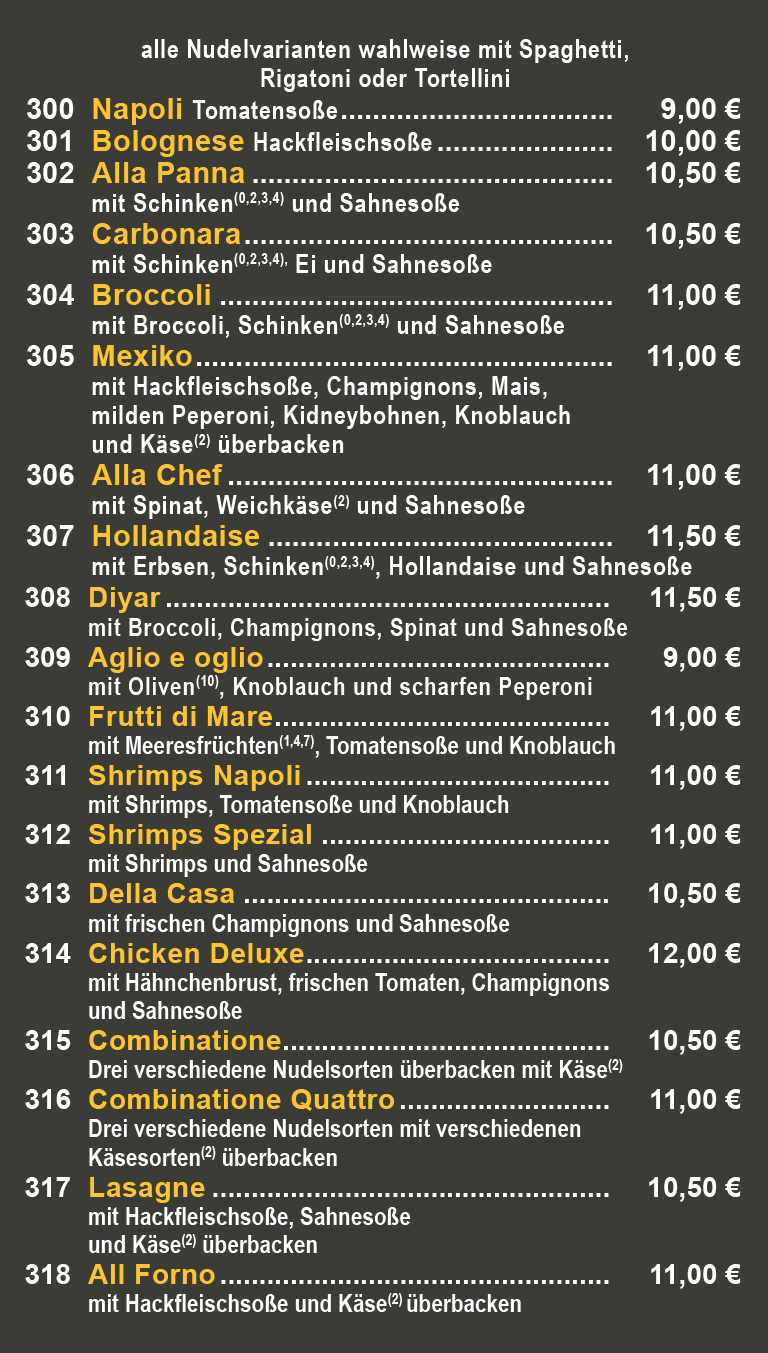 alle Nudelvarianten wahlweise mit Spaghetti, Rigatoni oder Tortellini