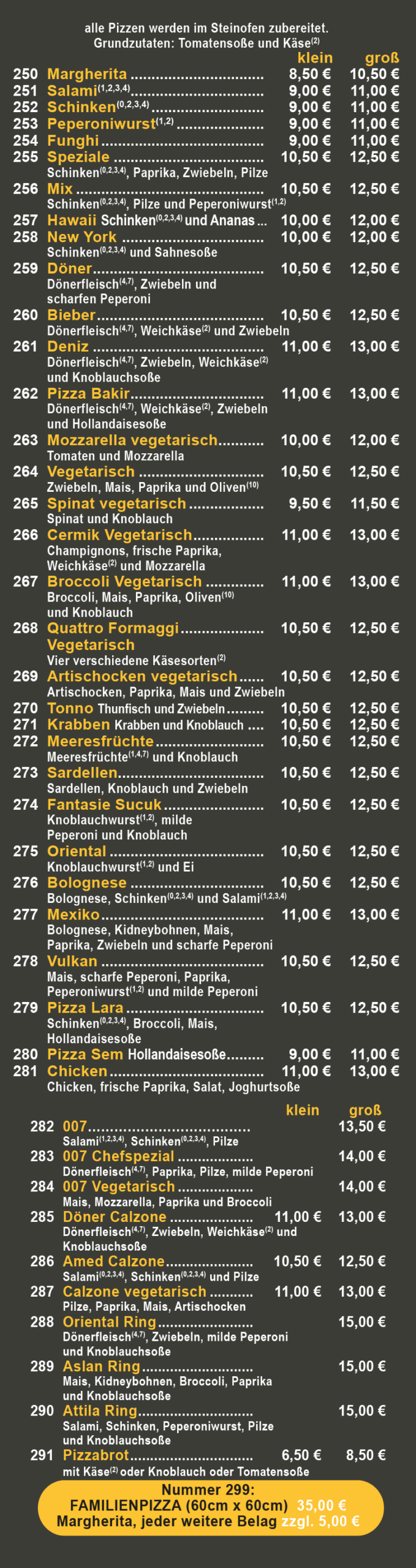 alle Pizzen werden im Steinofen zubereitet
